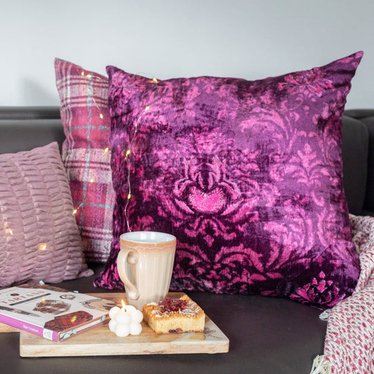 A regal damask design inspired from an exquisite confluence of Indian and Turkish cultures. Printed on fine luxurious velvet and finished off with exquisite metallic hand embroidery to highlight the delicacy of the motif. This cushion will add the perfect royalty to your space