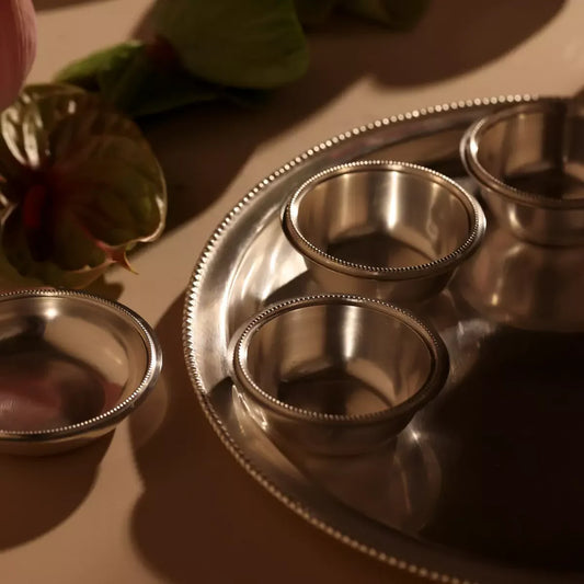 Dining Tables are a place where the entire family gathers over food, laugh and quality time. There is nothing better than having a festive dining table and eating like royalty in our chaandi thali sets. Simple, modern and minimalistic look and feel of these thaalis make them look stunning and they can be passed down to generations to come.