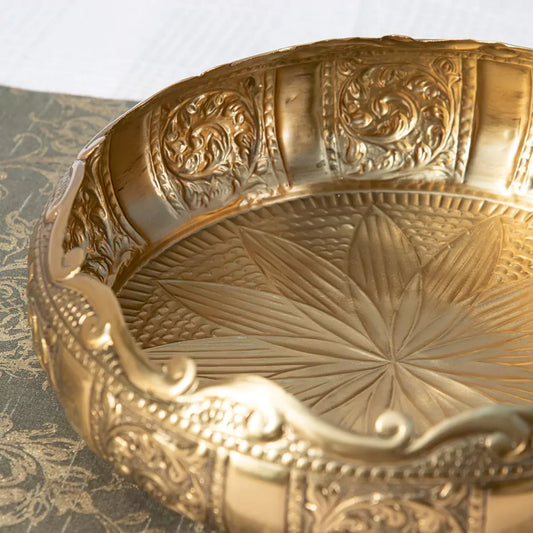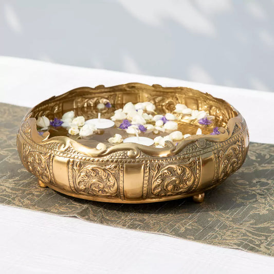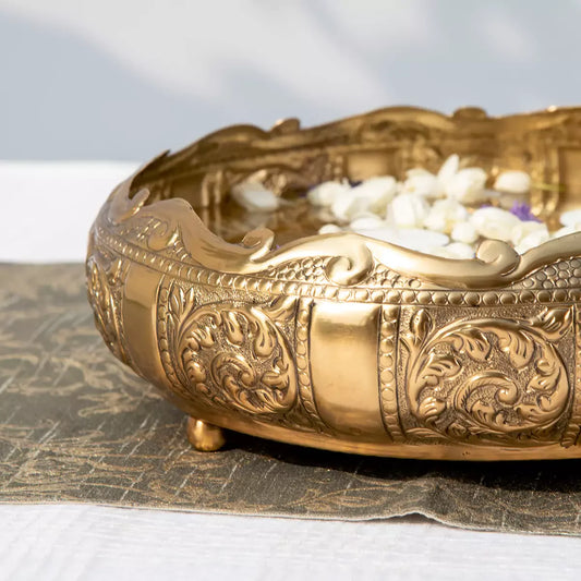 The cut on the edges makes this urli truly unique. With hand done embossing throughout the piece, this urli has multiple uses and can be used in different ways. Handmade in brass, they are heavily embossed even at the bottom, making them a perfect fit to be flipped around upside down and to be used as a chowki if needed.