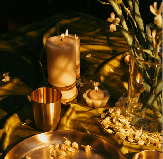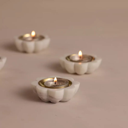 We're five from the same family—ideally shaped to hold a tealight each, made in marble & brass. Just place one in our identical, lotus-shaped marble structures for a golden glow in living spaces. We promise to create a warm setting, whether it's on dining tables, in your prayer settings, along the window sill for a festive feel or even in the middle of rangoli designs.