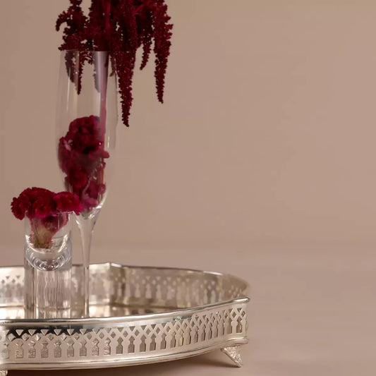 Add style to your home with this charming brass tray plated in silver. These Trays are truly unique because of their curved shape - It can be used as a vanity tray, in the center of dining tables with candles or for serving.