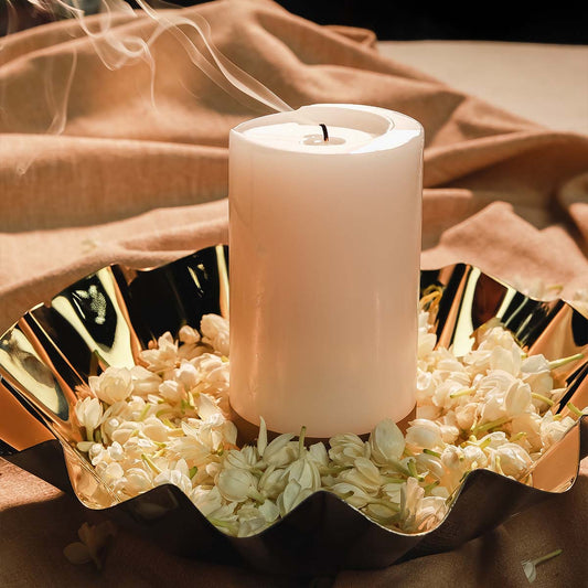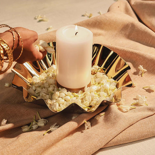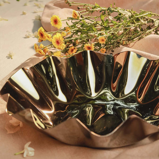 Discover me, your elegant stainless steel bowl in a stunning silver and gold duo. My wavy design is perfect for Diwali celebrations, whether as a chic candle holder or a lovely urli for floating candles.