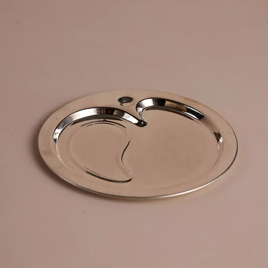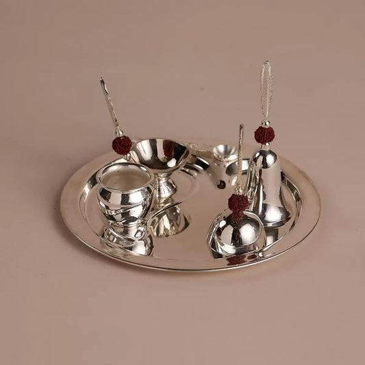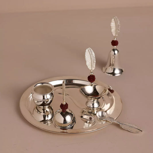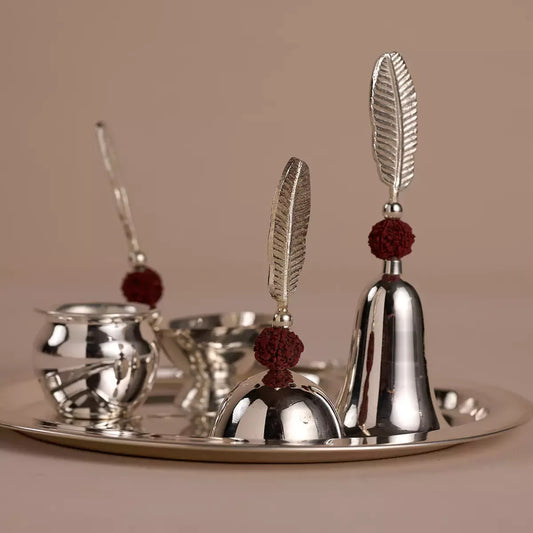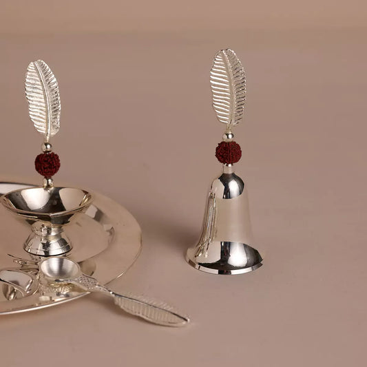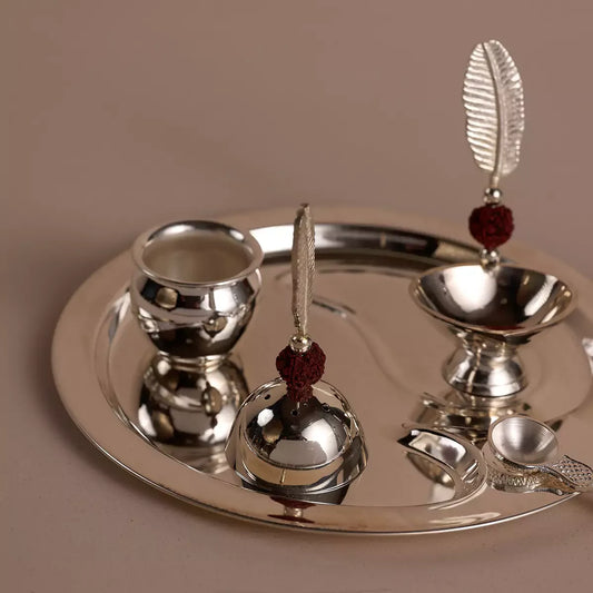 We are a large family and will marry perfectly with yours. We're a silver-coated brass set, and among us are festive essentials—a thali, a diya, a Kalash, an incense holder, a spoon and a bell. We just want to bring a little dazzle to your festivities.