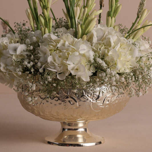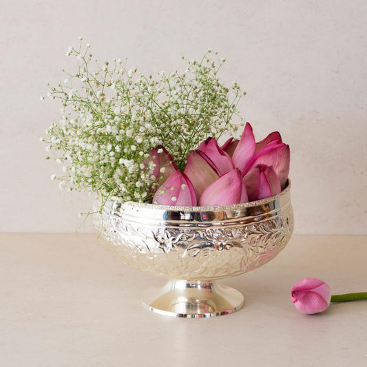 This captivating, magical enchanted forest urli/centerpiece with royal elephants has its own story to tell. It takes you to the whimsical forests and lands far far away. This product is completely handcrafted in pure brass. It is dipped in pure silver and lacquered.