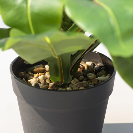 The Decor Remedy plants come potted in a black plastic pot, the base of the plant from where the stems grow out is covered in small mini pebbles and the whole plant is attached to the black plastic pot that can easily be slid into our planters.