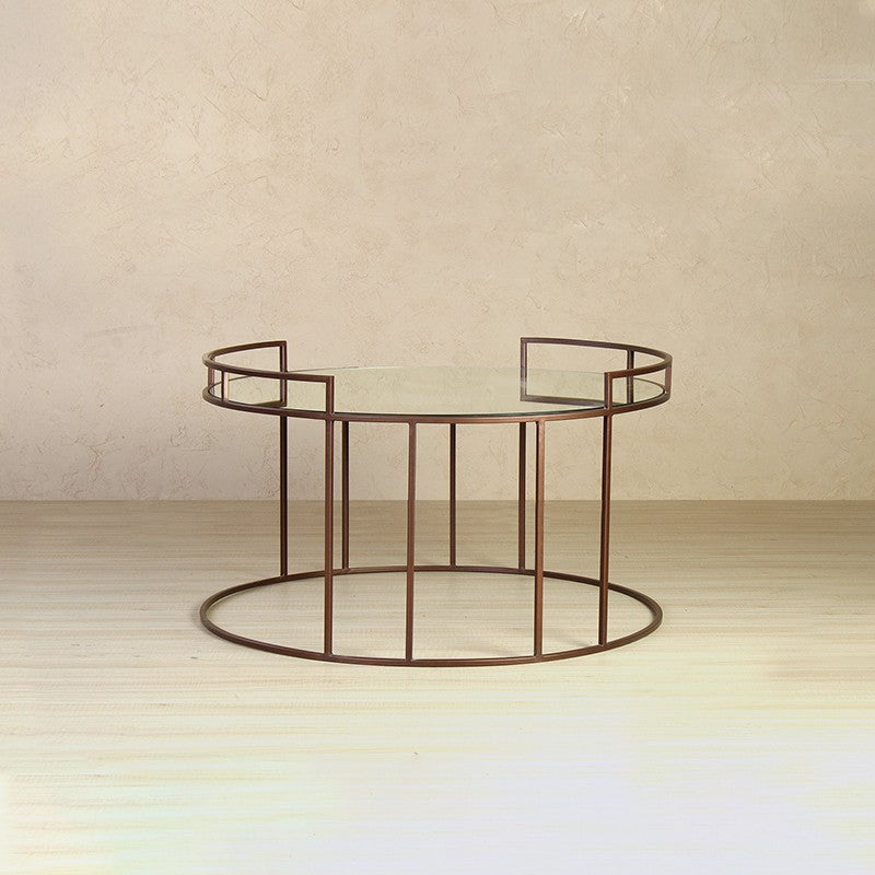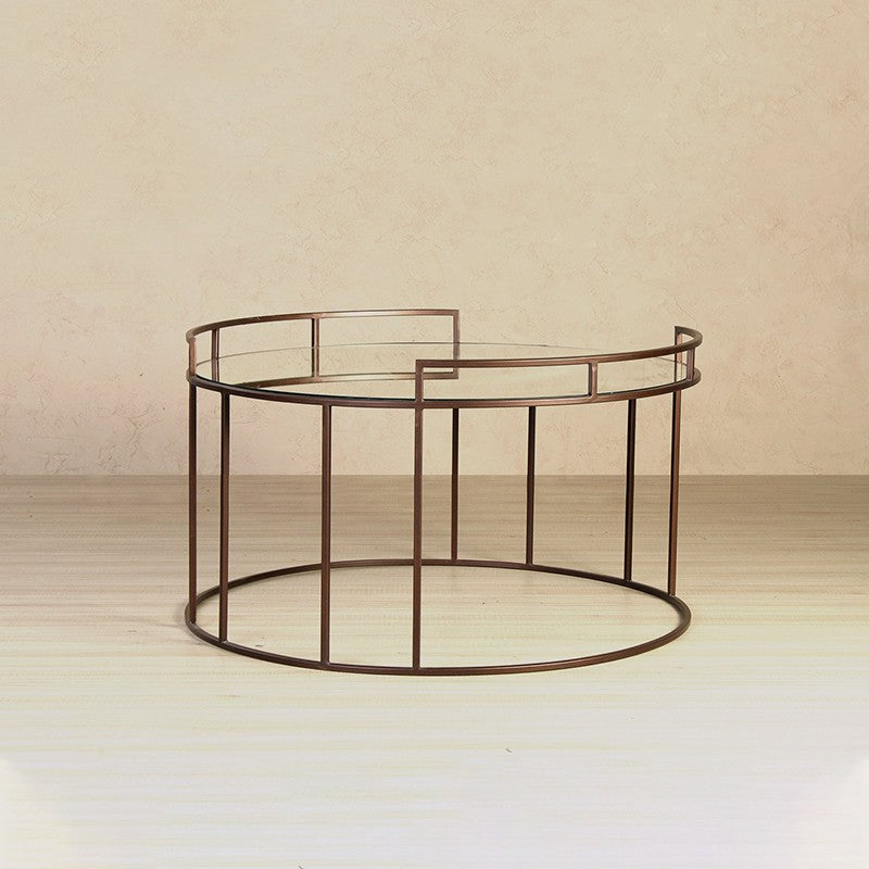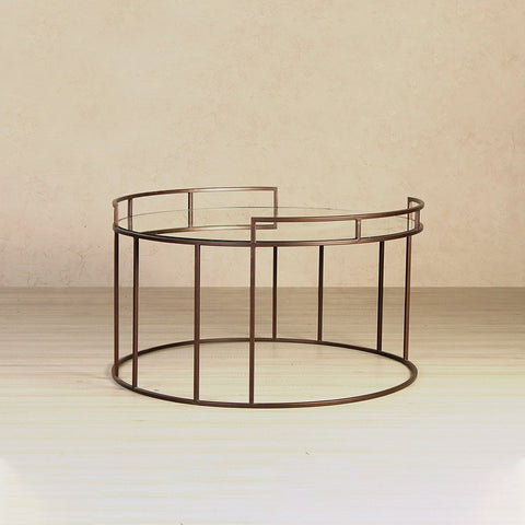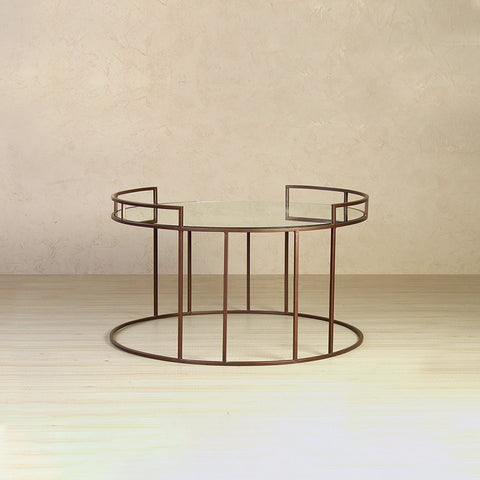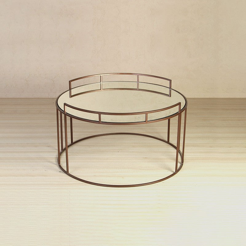 Featuring an open, almost geometric base in iron, this contemporary round coffee table includes a 10mm mirror tabletop. A stylish addition to any seating area, a bronze frame finish adds a touch of glamour.