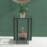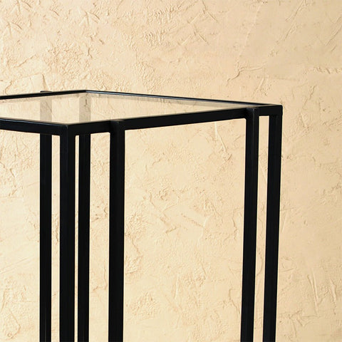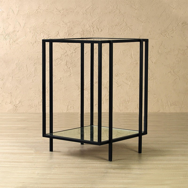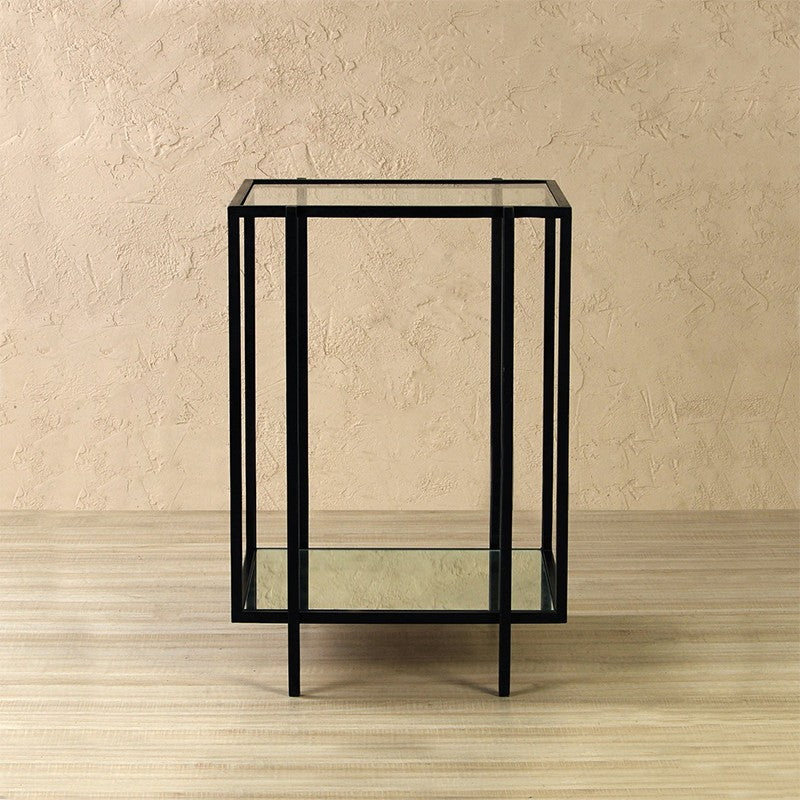 This side table from Clayton Collection has two-tiered shelf top with clear glass and bottom with mirror, supported by iron legs and finished in matte dark black. Whether it's sidled up next to a sofa or flying solo holding a floral arrangement, this classic piece accents any architectural style. The materials create contrasting lightness and strength in your space.