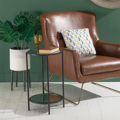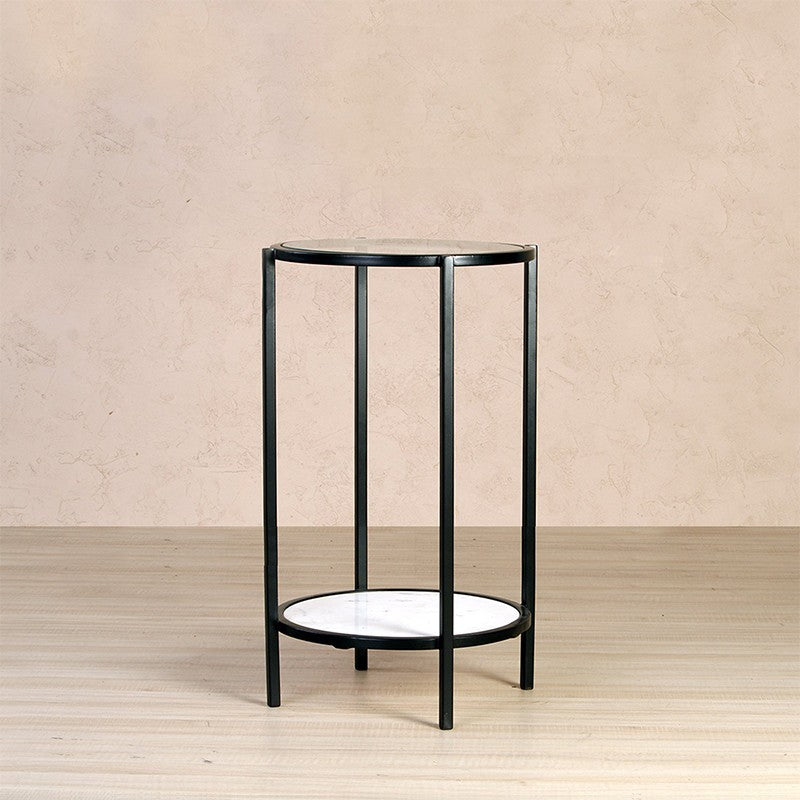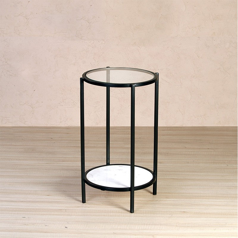 This side table from Clayton Collection has a two-tiered shelf top with clear glass and bottom with wonder white marble, supported by iron legs and finished in matte dark black. Whether it's sidled up next to a sofa or flying solo holding a floral arrangement, this classic piece accents any architectural style.
