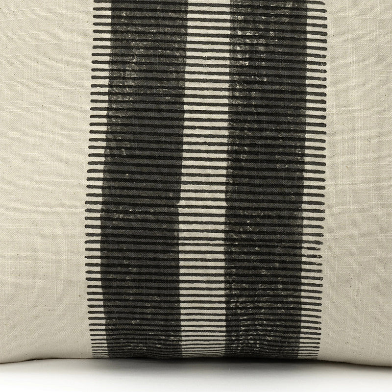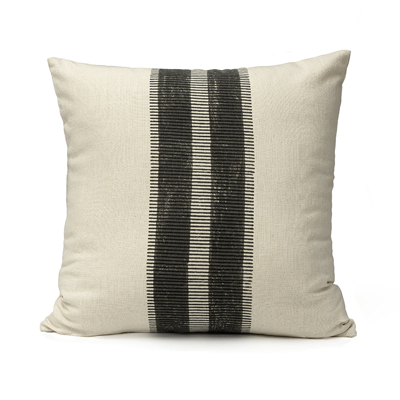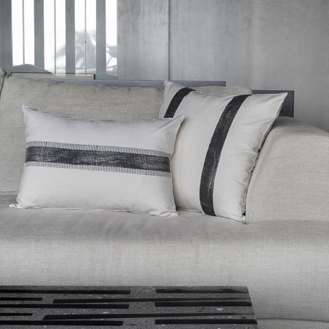 Our signature geometric block print in charcoal has been inspired by the art and culture of the Naga tribes. Each piece has been lightly block printed to emulate a rustic, unfinished vibe and can be easily paired with solid black or charcoal cushions to enhance the collection.