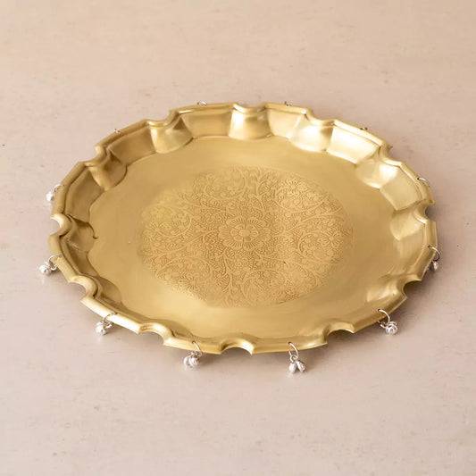 The beautiful matt gold thali is made in pure brass and has multiple detailing.