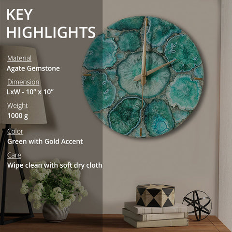 Introducing Gemtherapy's Green wall clock, a picturesque piece of wall decor. This designer wall clock features vibrant green agate stones that will breathe fresh life into any surrounding. The subtle golden of numbers and hands add the finishing touches of perfection to this unique wall clock. Ideal for any space, this designer wall clock goes beyond decor and has the ability to become the centerpiece of your home decor. At the same time, the soft circular shape of the timepiece ensures it is humble enough to blend into the background when you need it to do so.