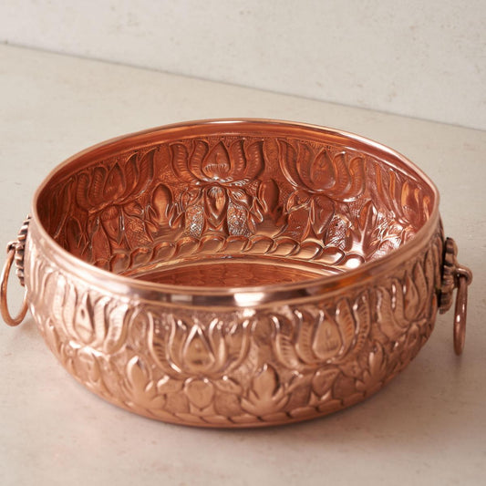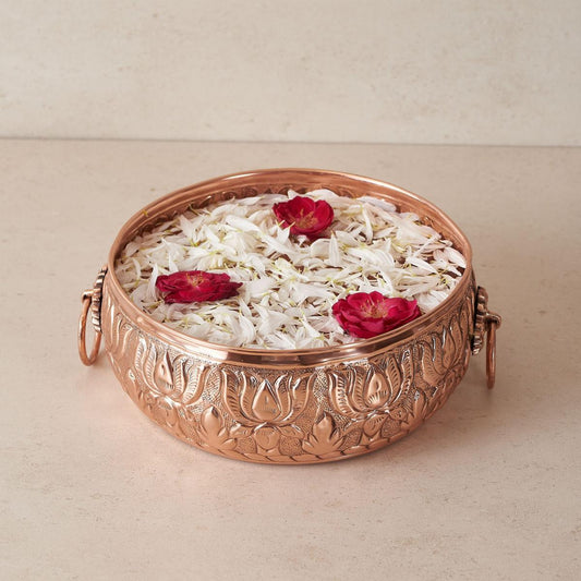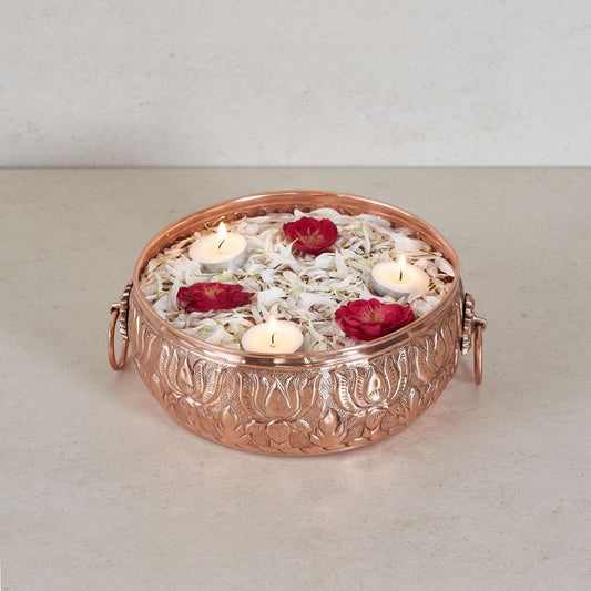Our Pure Copper urli bowls have a beautiful lotus pattern embossed over them. Water filled urlis with flower petals and t-lights, not only look pretty and festive, they also have a significance in Indian culture and tradition as per our history. They are said to bring good luck, wealth and peace.