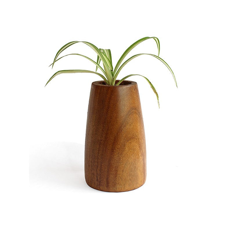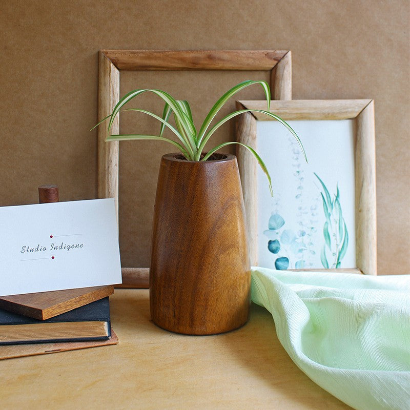 Introducing Studio Indigene’s Conical planter, a simply breathtaking piece. The indoor planter is a rich brown color with exquisite curves showcasing the work of the artisans. The elegance of this wooden planter is unmatched, making it a great addition to any space. The sophisticated design makes this a truly versatile piece, allowing you to use it as an office planter and a fancy centerpiece for your living room. This tabletop planter has a certain charm that is rarely found in such a simplistic piece of decor.