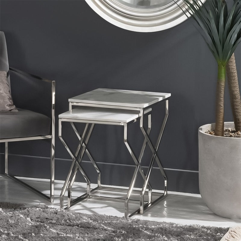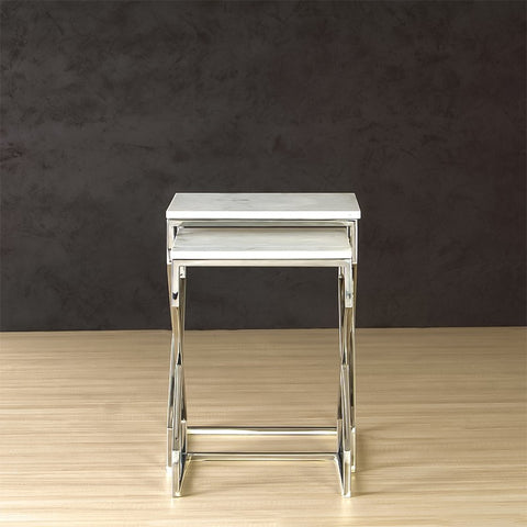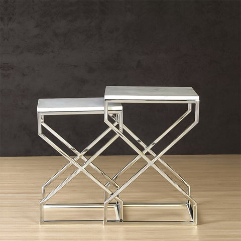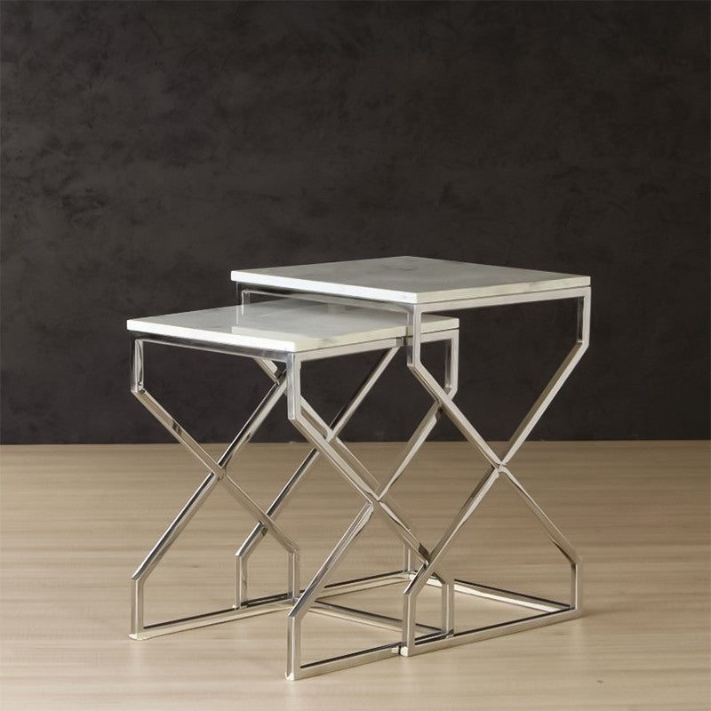 This Wonder White Marble Nesting Table with its clean geometric forms and outlines offers a superbly glamorous contemporary design. The beautifully polished stainless steel base featured together with wonder white marble top fits perfectly in any modern setting.