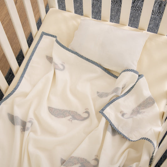 The Peahen Block Printed Kids Dohar is a charming and comfortable bedding accessory specially designed for children. Created with meticulous craftsmanship, this dohar showcases an exquisite block-printed pattern featuring the elegance of a peacock. The soft and breathable fabric ensures a cozy and pleasant sleeping experience, ideal for a peaceful night's rest or a soothing nap.