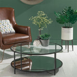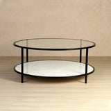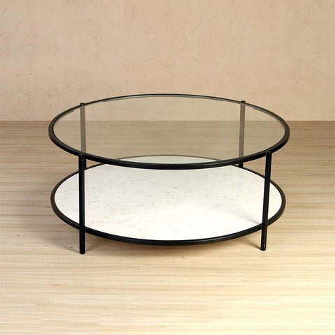 This Coffee Table from Clayton Collection has a two-tiered shelf top with clear glass and bottom with wonder white marble, supported by iron legs and finished in matte dark black. This classic piece accents any architectural style.