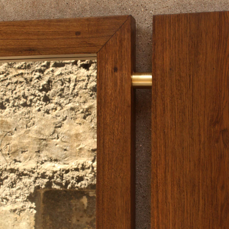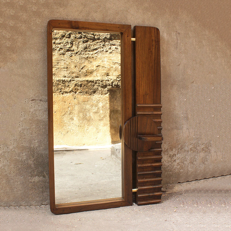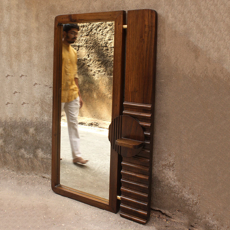 The mirror, handcrafted from reclaimed teak wood, can be wall-hung or leaned against the wall. A small shelf holds your daily grooming accessories.